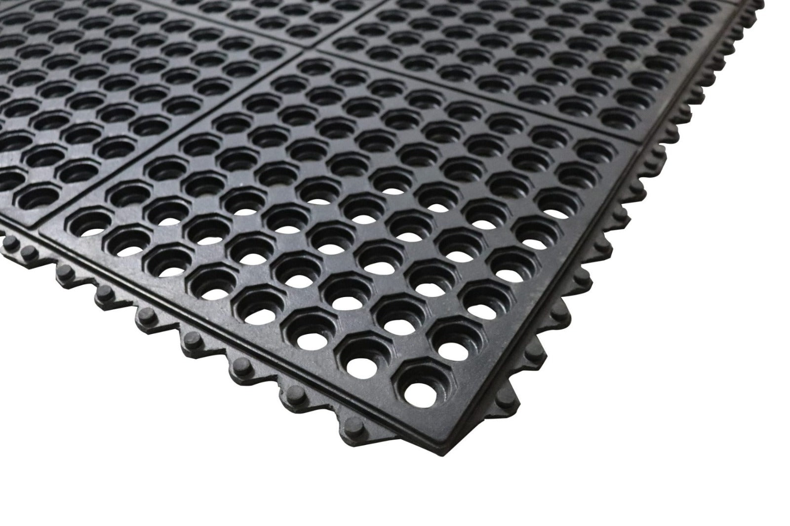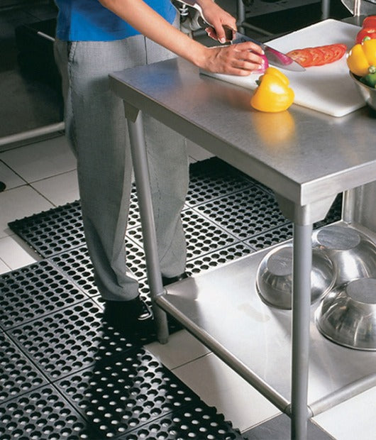 Tapete antifatiga perforado fabricado en hule SBR, diseñado para proporcionar comodidad y seguridad en áreas de trabajo húmedas o resbaladizas. Su diseño con perforaciones facilita el drenaje de líquidos, evitando acumulaciones de agua y reduciendo el riesgo de caídas. Ideal para cocinas industriales, bares, talleres y estaciones de trabajo.